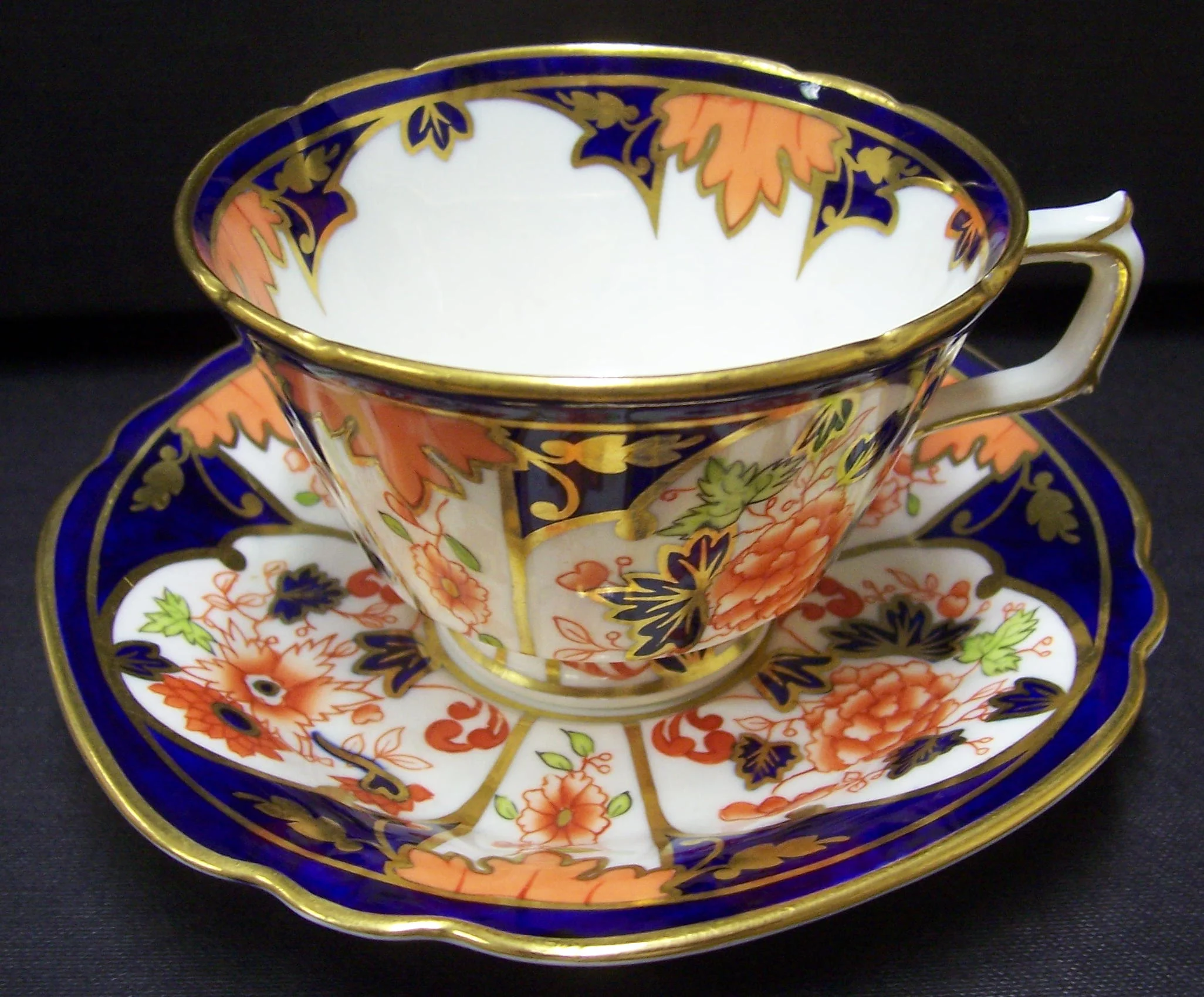 9803 – Talbot shape teacup and saucer with ivory ground all over. Similar to 9766 but with the green enamel extending over part of the rim. A plate in the red enamel version bearing the same pattern number is also included. 9810 – Square Chelsea shape cup and saucer. Cobalt ground with pattern hand gilt and enamelled in orange and light green. Thick gold edge and inner line. Traced gold handle. The gilding on this set is of an exceptional quality. 9812 – Square Chelsea shape teacup and saucer. Blue printed pattern with enamelling by hand. Gilt edge and foot line. Traced handle.