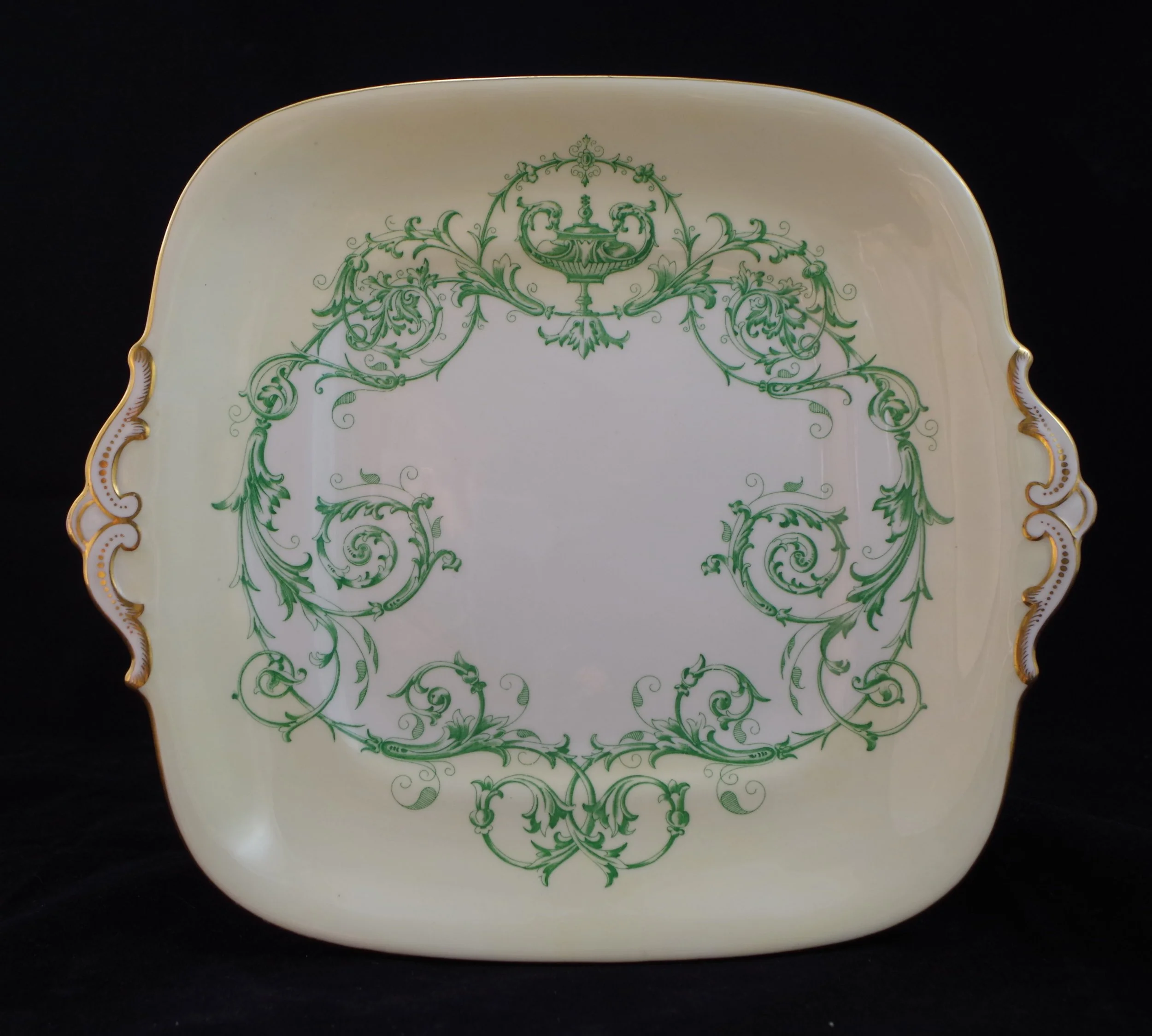In the pattern book A100 is listed in the Ferrers shape but here it is in the Square Chelsea shape. A106 is a saucer in the Tavistock and Talbot shape and has platinum and gold gilt acorns. Ivory ground. Patterns A108 & A109 are both in the Gadroon shape. A108 has green and silver tracing, with green and gold in the case of A109.